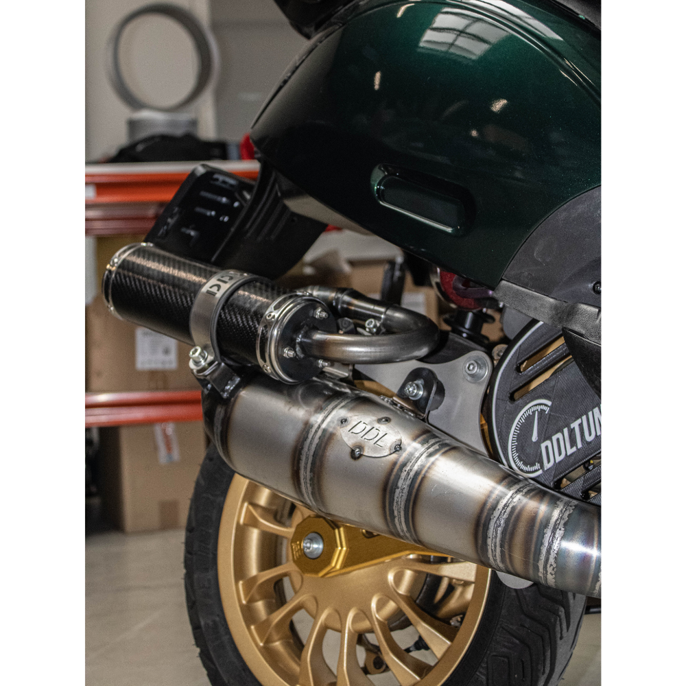 Discover the power of the DDL 360 Exhaust, designed for Piaggio and Gilera 125-180CC engines. What makes this exhaust so special? The renewed curl damper system, similar to the popular PM59, optimizes the exhaust gas flow and produces a more powerful sound. The standard carbon damper gives your motorcycle a sporty look.