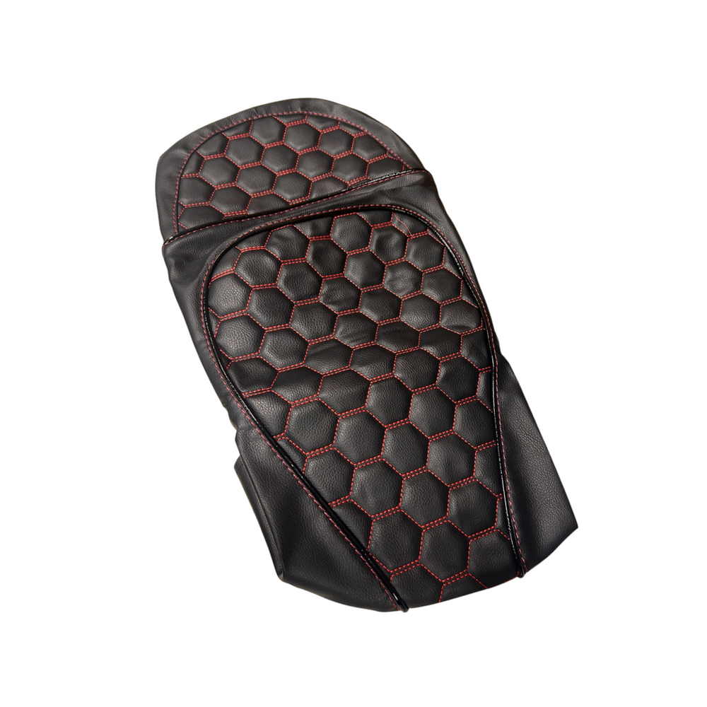 Upgrade your piaggio zip 2t/4t with the saddle cover RS ​​red! Made of high-quality PU leather with a sleek flat finishing, shiny black piping and a stylish hexagon pattern. The red stitching ensures a sporting and exclusive appearance. Handmade with an eye for detail and a perfect fit. Order now and give your scooter a unique look!