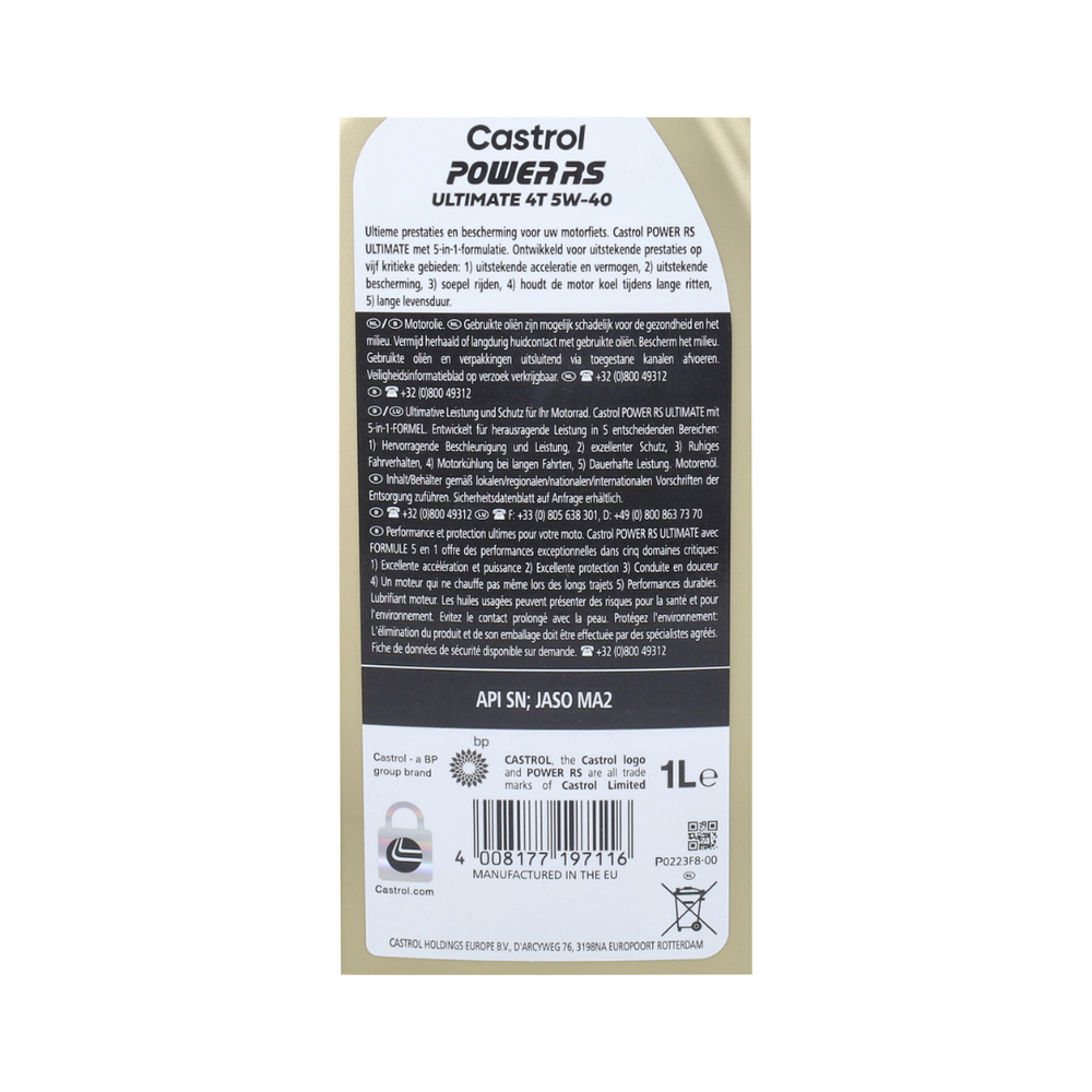 Castrol Power RS 4-stroke 5W-40 oil offers excellent protection against wear of internal engine parts. The oil contains special additives that reduce friction and extend the lifespan of the engine, resulting in less maintenance and a lower risk of expensive repairs. In addition, the oil is designed to improve the performance of the engine. Due to the better lubrication of the internal parts, friction is reduced, which ensures a smoother driving behavior and better engine performance.