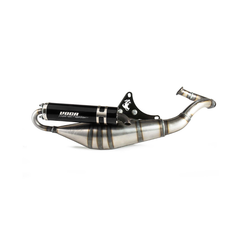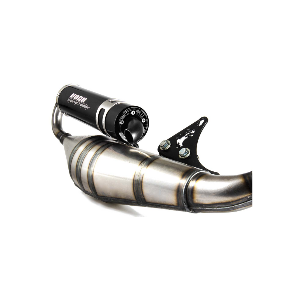 Pot d'échappement Voca 50/70cc Noir Piaggio 2 Temps, Le système d'échappement VOCA Sabotage V2 est un outil polyvalent absolu. Avec un cylindre standard de 50 cm3, l'échappement VOCA Sabotage V2 atteint des performances optimales. Avec un cylindre sport de 70 cm3, ce système d'échappement VOCA devient une véritable centrale électrique après avoir retiré la réduction de la bride d'échappement (si le système n'est pas utilisé sur la voie publique).