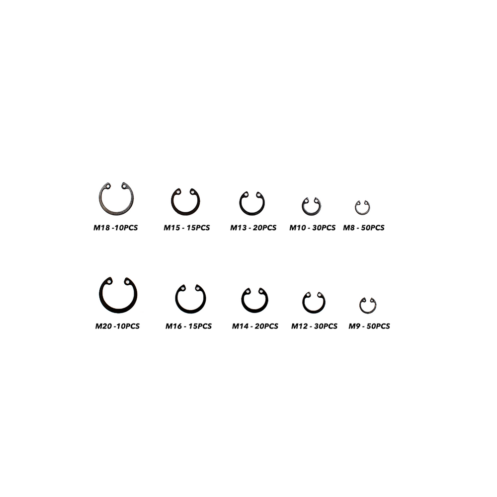 Set di anelli di bloccaggio completo con 250 pezzi di varie dimensioni, ideali per il montaggio e l'attacco di assi e perforazione. Adatto agli hobbisti e professionisti scooter in tecnologia, manutenzione di auto e macchine. Consegnato in una scatola di archiviazione ben organizzata. Indispensabile in ogni posto di lavoro!