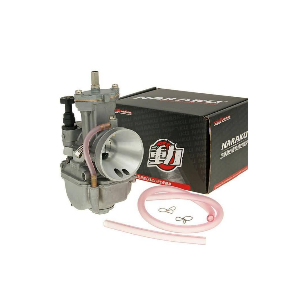 De Carburateur 21MM Racing Naraku is een geavanceerde Naraku Racing V.2 flat slide carb ontworpen voor scooters, quads en andere voertuigen met 70cc cilinders. Deze carburateur biedt verbeterde prestaties door een machinaal bewerkte inlaat en een Powerjet, die extra vermogen levert bij vol gas. Het zorgt voor een snelle en efficiënte brandstof- en luchtafgifte voor betere acceleratie en topsnelheid.