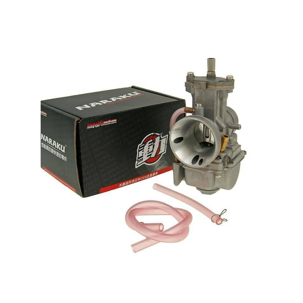 De Carburateur 30MM Race Naraku is een Naraku Racing V.2 flat slide carburateur die is ontworpen voor scooters, quads en andere voertuigen met 70cc-90cc 2-takt cilinders of 4-takt voertuigen van 125-300cc. Deze carburateur biedt uitstekende prestaties dankzij de machinaal bewerkte inlaat en de Powerjet functie, die extra vermogen levert bij vol gas voor verbeterde acceleratie en topsnelheid.