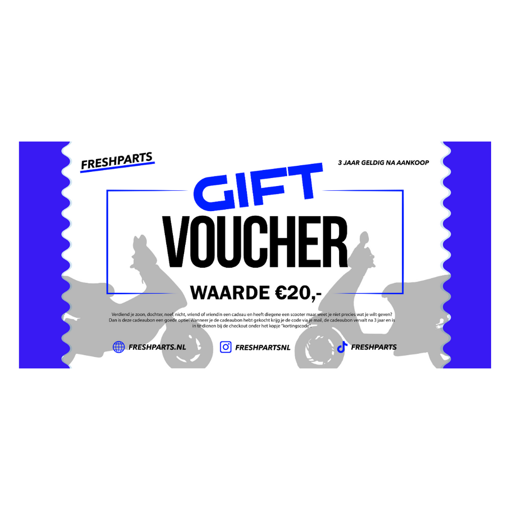 Verdiend je zoon, dochter, neef, nicht, vriend of vriendin een cadeau en heeft diegene een scooter maar weet je niet precies wat je wilt geven? Dan is deze cadeaubon een goede optie! Wanneer je de cadeaubon hebt gekocht krijg je de code via je mail, de cadeaubon komt nooit te vervallen (mits je hem volledig gebruikt hebt) en is in te dienen bij de checkout onder het kopje ''kortingscode''.