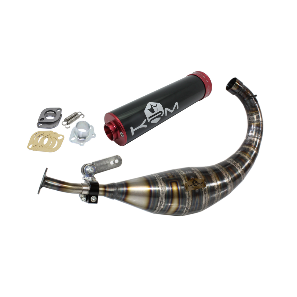 De KRM Uitlaat Rood 90–100cc Derbi is een hoogwaardige performance-uitlaat, speciaal ontwikkeld voor Derbi 90cc en 100cc race- en tuningsets. Dankzij het geoptimaliseerde expansiedesign levert deze uitlaat een krachtige powerband, extreem snelle gasrespons en maximale topkracht. De demper heeft een strakke rode afwerking en geeft bovendien een agressieve, professionele look die perfect past bij elke high-end setup.