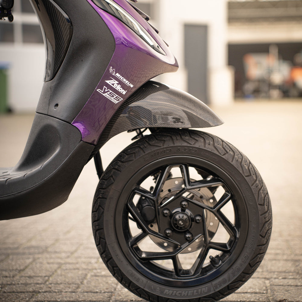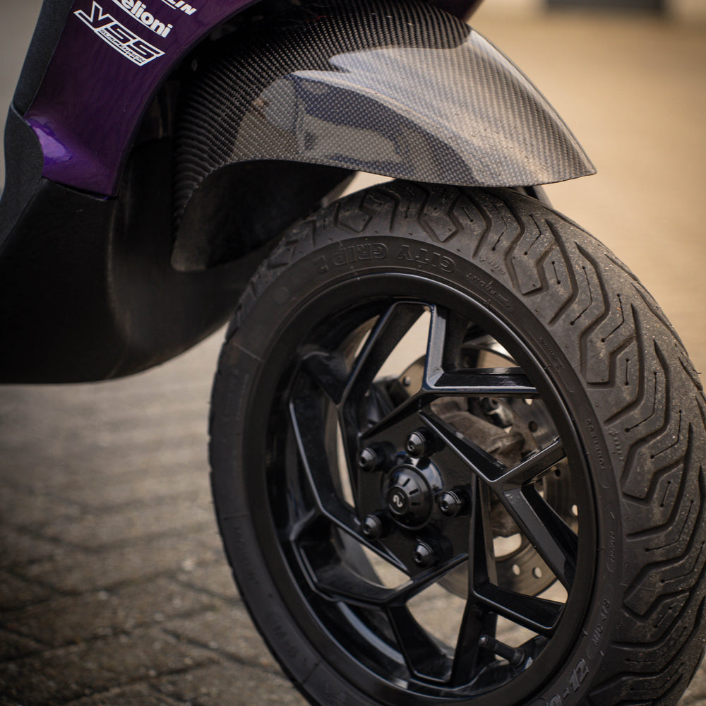 Dit product is passend op een Vespa Sprint voorvork en ook de Zip SP voorvork, hiervoor zal je de naaf iets af moeten draaien wil die mooi recht uitlijnen met het spatbord.