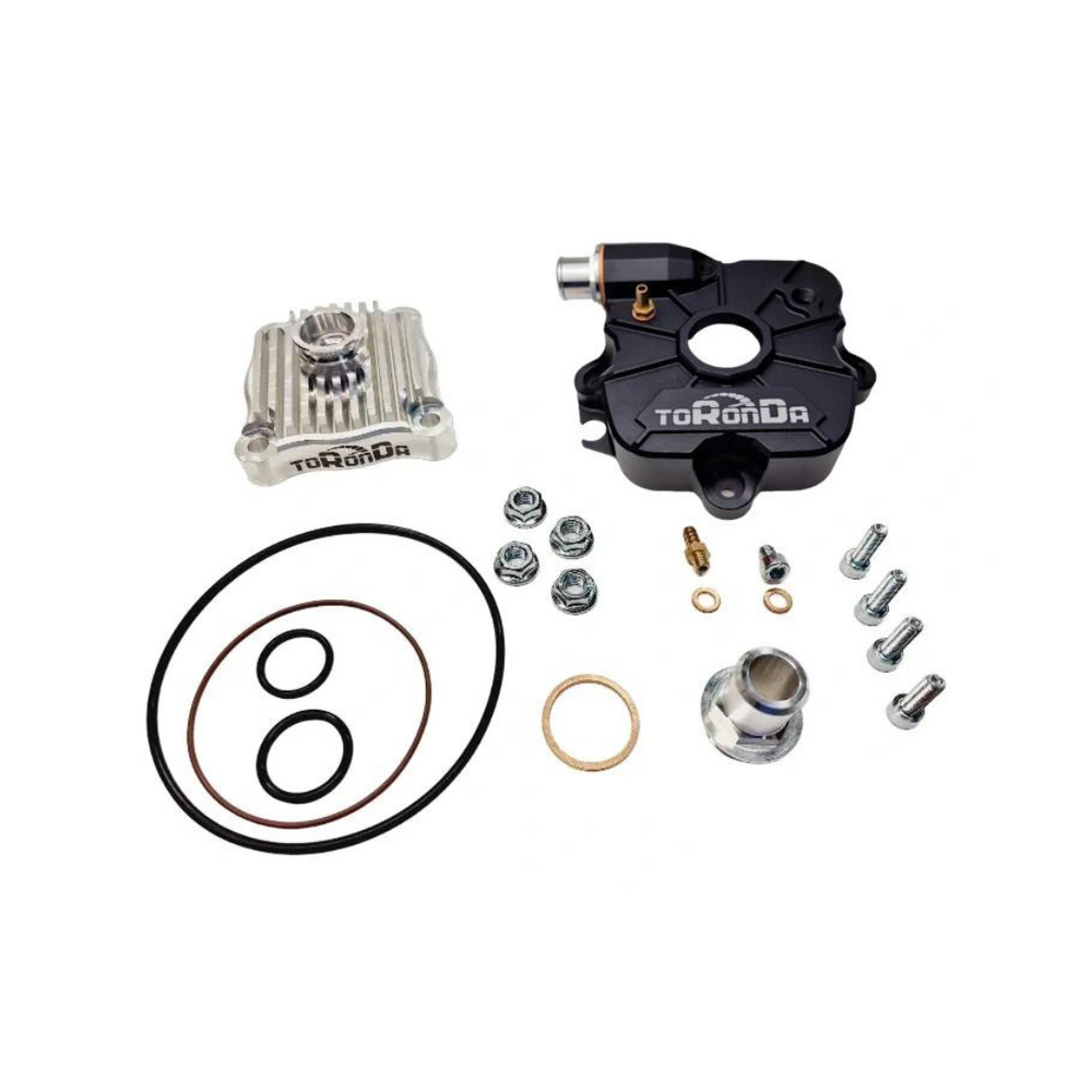 De Toronda CNC Cilinderkopset 55MM Zwart is een high-performance cilinderkopset, ontworpen voor Piaggio en Gilera 125-180cc motoren. Met een 55mm slag en een keuze uit 65 of 65,6mm boring, biedt deze set ongeëvenaarde prestaties, compatibel met Malossi, PM, en standaard 180cc motoren. De centrale bougie (M14, originele maat) zorgt voor een verbeterde verbrandingskamer, wat resulteert in nog hogere prestaties dan onze 52 binnenkop. De set wordt compleet geleverd met alle benodigde bouten en pakkingen. De aanbevolen squish is 0,9-1mm. Let op: Past niet op Italjet Dragster zonder aanpassing.